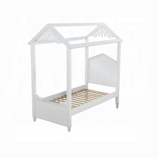 ACME Rapunzel Twin Bed, White (1Set/2Ctn), 82" x 60" x 85"H, 161lbs. Your children will adore the magical Rapunzel bed that evokes the spirit and appeal of a cottage house. This unique canopy bed sits inside a classic house frame, with an arched headboard, low profile footboard and canopy with raised molding trim and scrolled motifs, all in a classic white finish. Matching case pieces include a lower trundle that can hold a mattress for additional guests or can be used as a drawer providing additional storage space. This artistically imagined bed is expertly designed to withstand the test of time and provide your little ones with enduring comfort and adventure. See creativity flourish as kids play in this house-inspired bed. Features: - Box Spring NOT Required - Youth Canopy Bed - Cottage Design - Wood Construction - Trundle Sold Separately Materials: Wood, Composite Wood