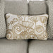 Imagine your space elevated with a centerpiece like this one. This living room group features sloped armrests for relaxed seating, while the removable box cushions with matching welt trim make maintenance an easy task, especially with its stain-resistant fabric. Beautiful lines and patterns on the matching chair, ottoman, and accent pillows bring splashes of gold to the neutral gray base color. Fully upholstered, this piece is great for any transitional home wanting a substantial update in looks and comfort.