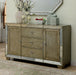 Dine in style with this fabulous Antique Gold finished dining server. Antique mirrors accent the set, adding soft reflections that glimmer in natural light.
