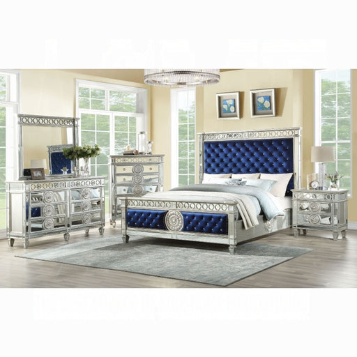ACME Varian Nightstand, Mirrored, 32" x 19" x 31"H, 97lbs. The Varian nightstand provides a commanding presence in any room. Add a dash of glam to your bedroom with this Varian nightstand, it features four tapered legs and 2 storage drawers with crystal-like knobs. This gorgeous nightstand is accented with raised geometric patterns and mirror finish. This fashionable nightstand will fuse with the surrounding Decor, transforming a room from ordinary into something interesting and sophisticated. Features: - Casegood: Mirrored Top, Front Drawers & Trim - Casegood Drawer: Glide Side Metal, Dovetail English Front & Back, Felt-Lined Top Drawer Materials: Wood, Mirror, Composite Wood